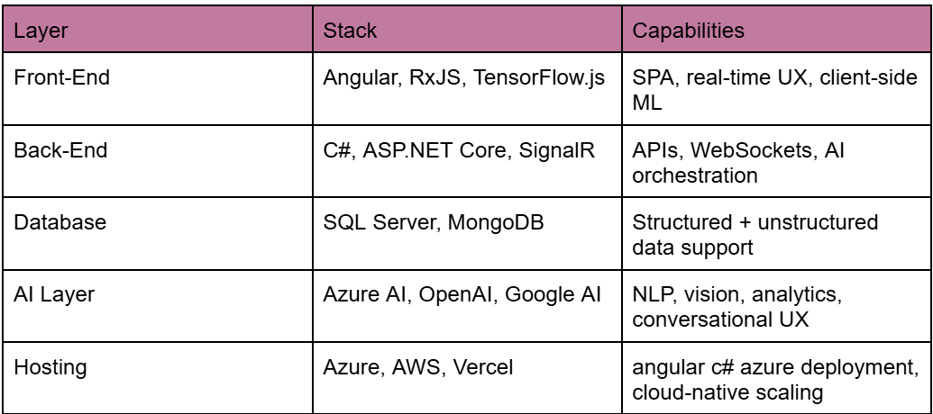 This technical architecture outline describes what a modern stack is that serves to support smart Angular and C# (.NET Core) web applications. It will highlight the collaboration between layers to provide intelligent and fast digital experiences. Angular full stack development lies in the heart of this workflow whereby the front-end capabilities are integrated with scalable back-end service, databases, AI features and cloud hosting.